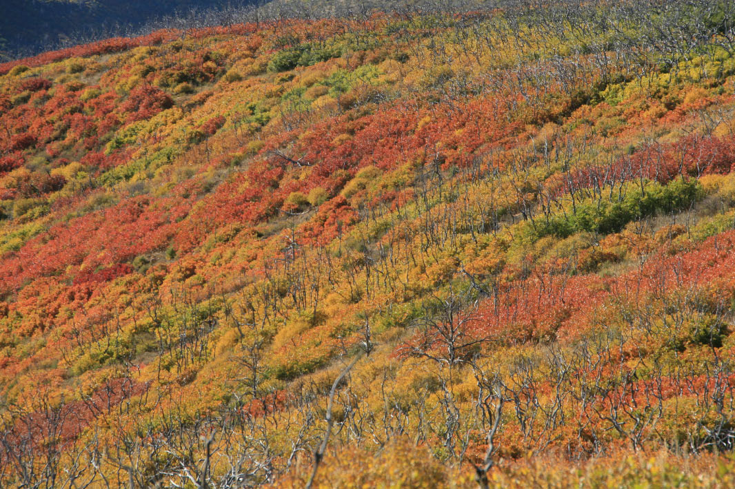 Il y a eu un incendie de forêet et nous voyons beaucoup d'arbustes noircis au milieu de la végétation d'automne colorée.